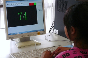「フラッシュ暗算」とは、パソコンの画面に表示される数を珠算式暗算を使って計算します。暗算練習と同じように、そろばんの珠をイメージして頭に浮かべそれを実際のそろばんと同じように動かし計算をしていきます。暗算練習(8級より)を行ってからパソコンを使って練習します。月に1回「日本珠算連盟」のフラッシュ暗算検定を行います。